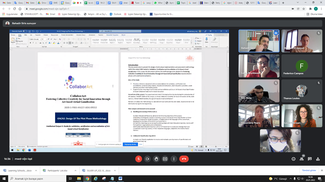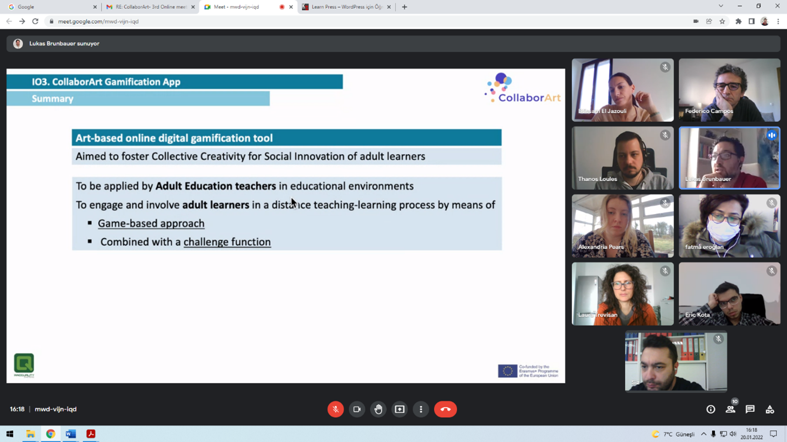 CollaborArt Projesi’nin üçüncü çevrim içi proje yönetim toplantısı tüm ortak kurumların katılımı ile 20 Ocak 2022 tarihinde gerçekleştirildi. Toplantıda proje kapsamında geliştirilmekte olan “Çok Dilli E-Öğrenme Platformu” ve “Oyunlaştırma Tabanlı Mobil Eğitim Uygulaması” üzerine fikir ve bilgi alışverişi yapıldı.