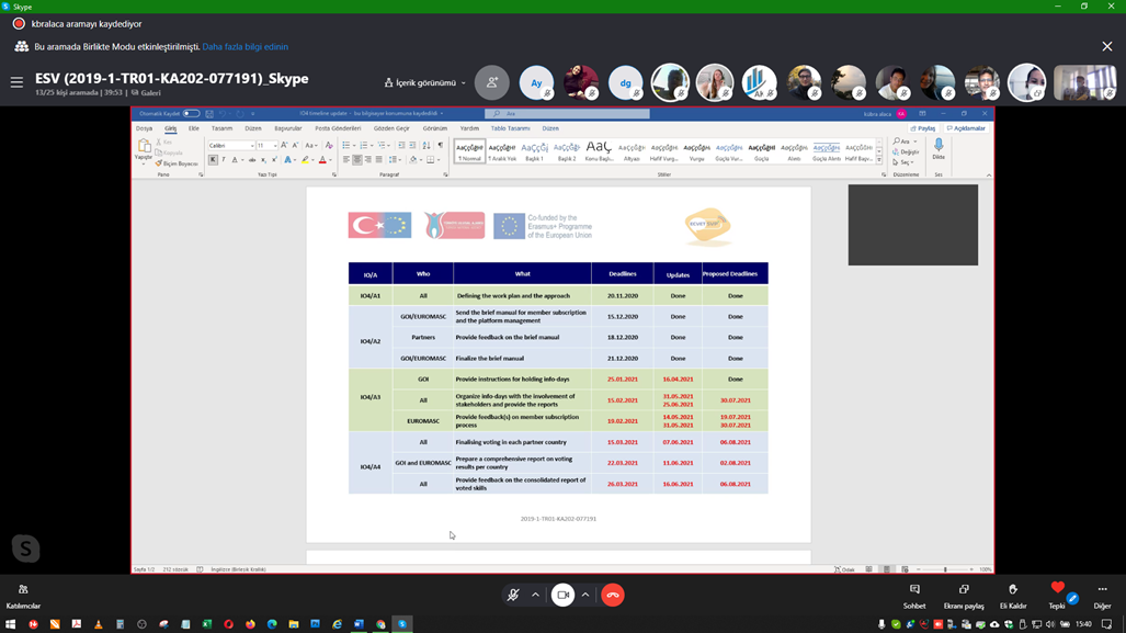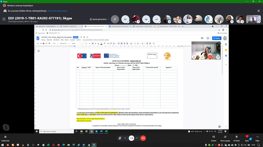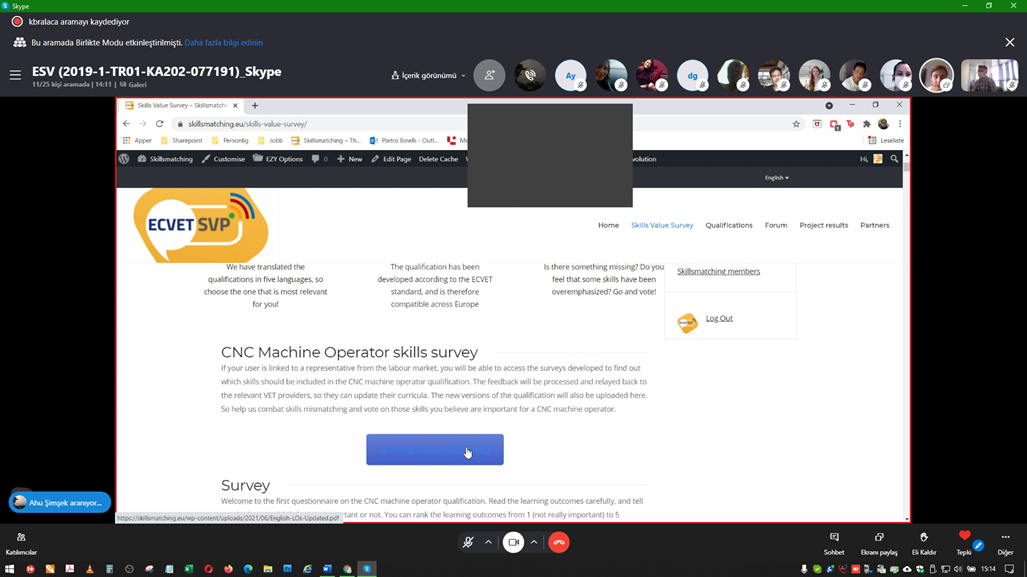 Proje ortak kurumlarının katılımıyla 08.07.2021 tarihinde gerçekleştirilen çevrim içi proje yönetim toplantısında Platform Tanıtım Günleri’nin gerçekleştirilmesine dair hazırlıklar görüşüldü. ECVET Beceri Değerlendirme Platformu ve sektör temsilcilerinin katılım sağlayacağı Beceri Değerlendirme Anketi’nin mevcut hali gözden geçirildi.