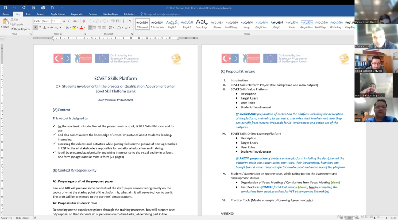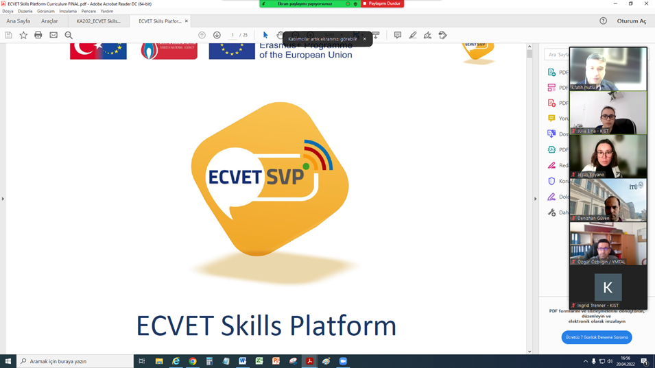 ECVET Beceri Platformu Projesi Dördüncü Ulus Ötesi Proje Yönetim Toplantısı tüm ortak kurumların katılımı ile 20 Nisan 2022 tarihinde Çevrim İçi olarak gerçekleştirildi. Toplantıda proje kapsamında geliştirilmiş olan ECVET Beceri Platformu’na ait öğrenci katılımları değerlendirildi, bunun yanısıra proje kapsamında ortaklar tarafından geliştirilen ve platformda yer alacak olan eğitim içerikleri üzerine fikir alışverişi yapıldı. Toplantıda ayrıca proje kapsamında üretilmiş olan Zengin İçerikli Öğretim Materyalleri incelenirken, Öğrenci Katılımı İçin Öneri Belgesi üzerinde gerekli planlamalar yapıldı.