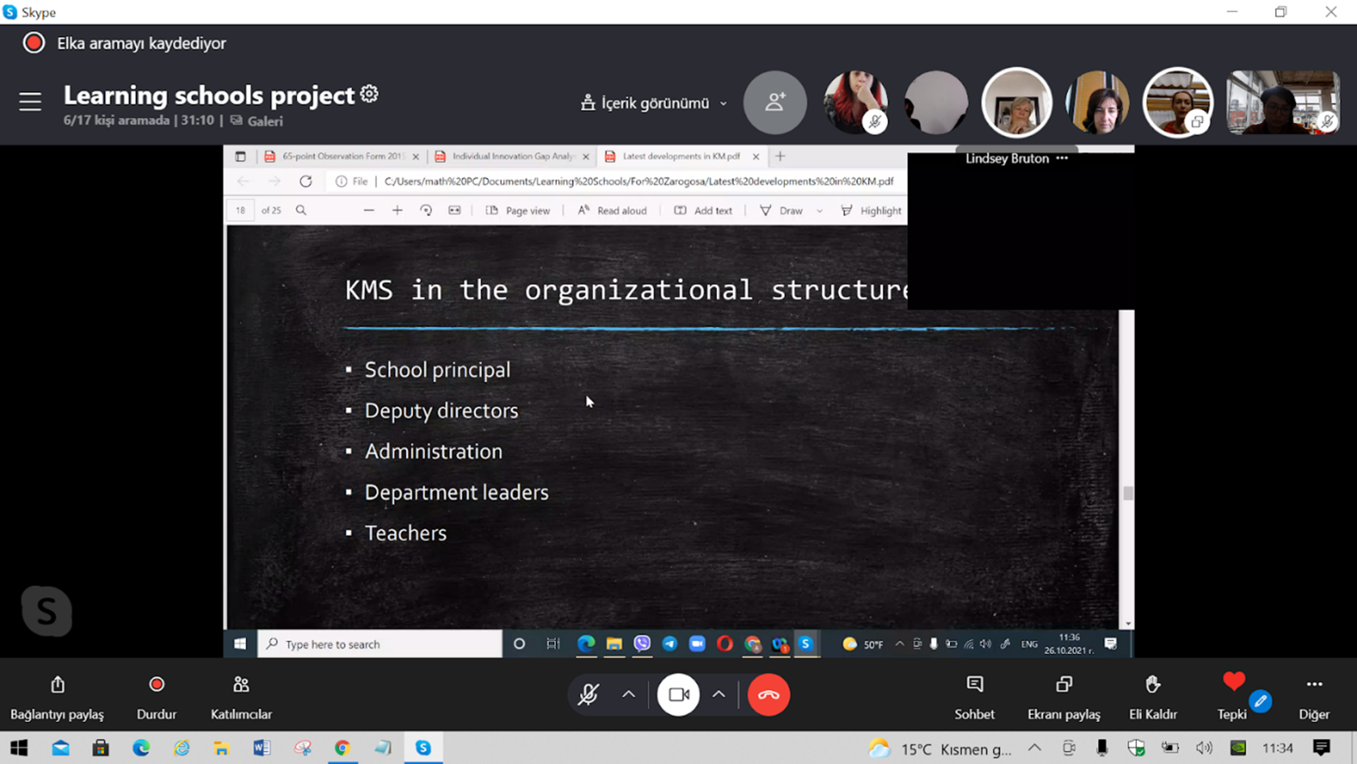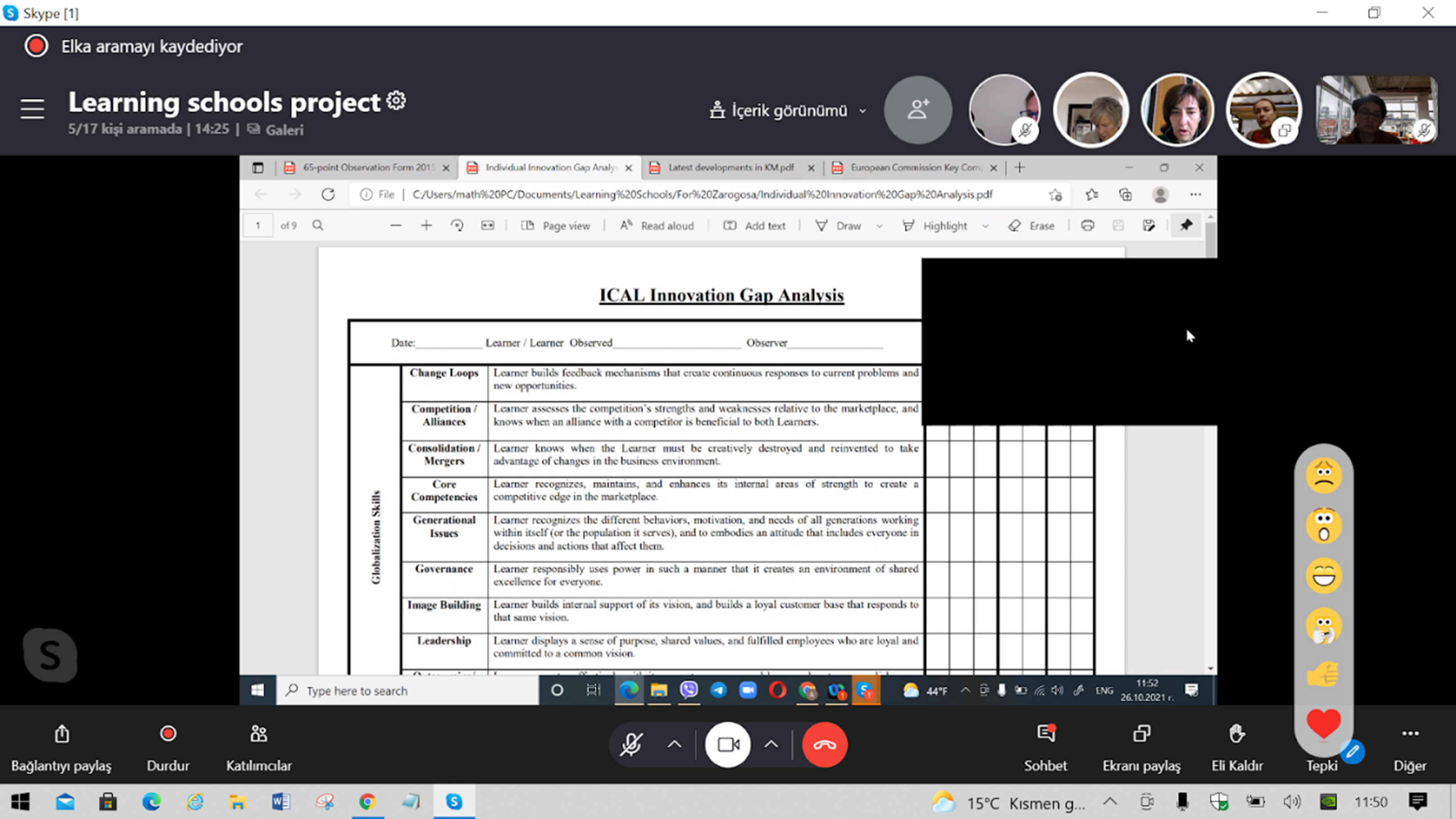 Proje ortak kurumlarının katılımıyla 26 Ekim 2021 tarihinde gerçekleştirilen uluslararası çevrim içi proje yönetim toplantısında proje faaliyetleri değerlendirildi. Proje kapsamında 22-24 Eylül 2021 tarihlerinde İspanya’nın Zaragoza şehrinde gerçekleştirilen kısa dönemli personel öğrenme faaliyetinin değerlendirmesi yapıldı. Öğrenen Okullar Durum Raporu gözden geçirildi.