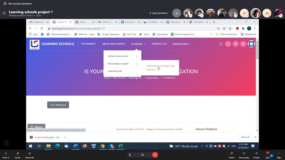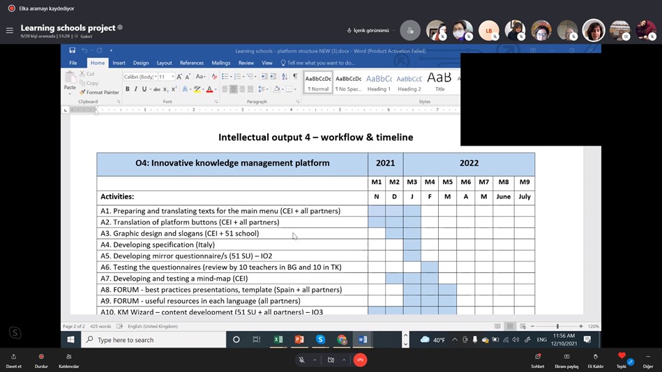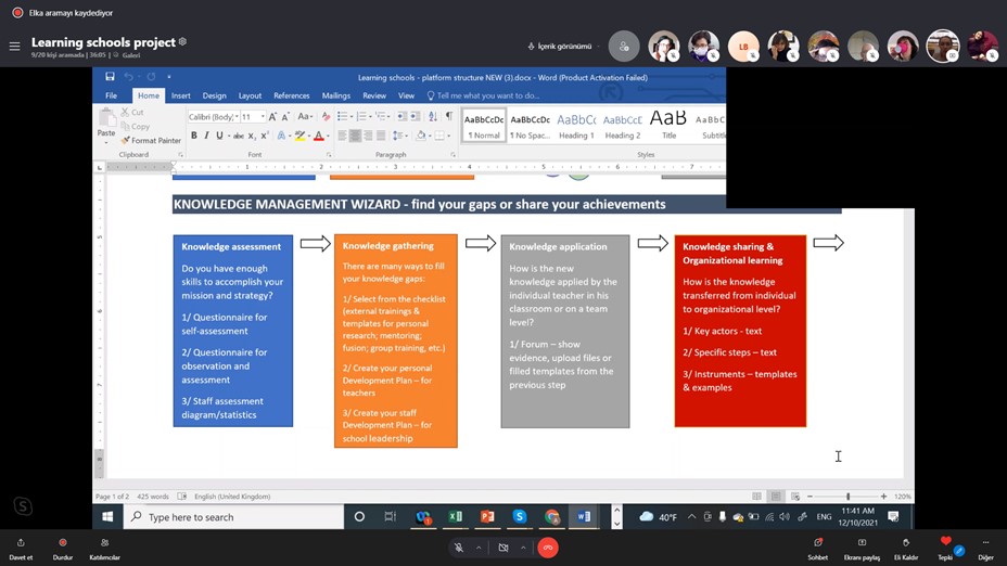 Proje ortak kurumlarının katılımıyla 10 Aralık 2021 tarihinde gerçekleştirilen uluslararası çevrim içi proje yönetim toplantısında Öğrenen Okullar Modeli ve Süreç Temelli Öğrenme Yönetim Sistemi araçları değerlendirildi. Yenilikçi Bilgi Yönetim Platformu taslağı gözden geçirildi