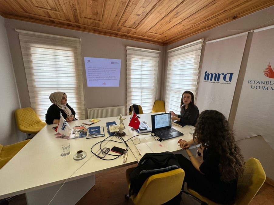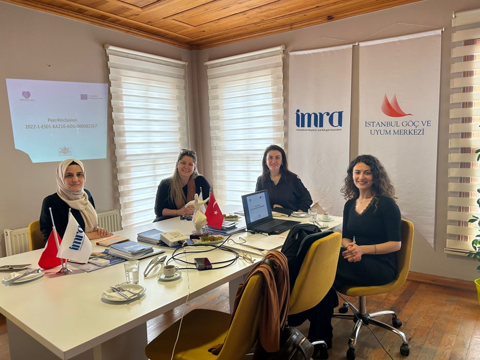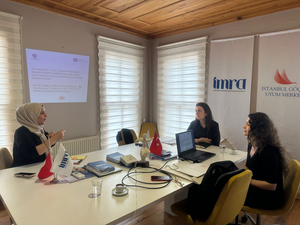Peer4Inclusion Projesi Ürün Değerlendirme Toplantısı 30 Mayıs 2023 günü İMRA – Uluslararası Göç ve Mülteci Derneği eğitmenlerinin katılımıyla gerçekleştirildi. Toplantıda proje kapsamında hazırlanan “Mülteci ve Göçmenler İçin Akran Mentorluğu Rehberi” incelenerek rehber içeriğine yönelik fikir paylaşımı gerçekleştirildi. Proje ürünlerinin doğrudan göçmen ve mülteci grupların sosyal olanaklarına katkı sağlaması sebebiyle ürünlerin yaygınlaştırılması ve hedef kitle ile paylaşılmasına yönelik planlamalar yapıldı.