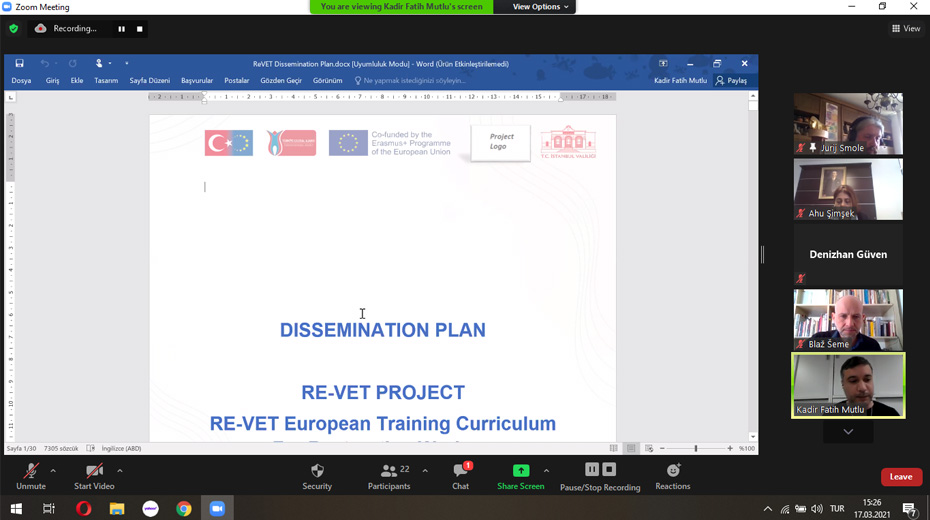 RE-VET Projesinin Başlangıç Toplantısı tüm ortak kurumların katılımı ile 17 Mart 2021 tarihinde çevrim içi gerçekleştirildi. Toplantıda proje faaliyetleri gözden geçirildi. Projenin ilk ürünü olan “Ortak Ülkelerdeki Yeterliliklerin Belirlenmesi ve Karşılaştırılması ile Çerçeve Programı” için çalışma planı sunuldu.