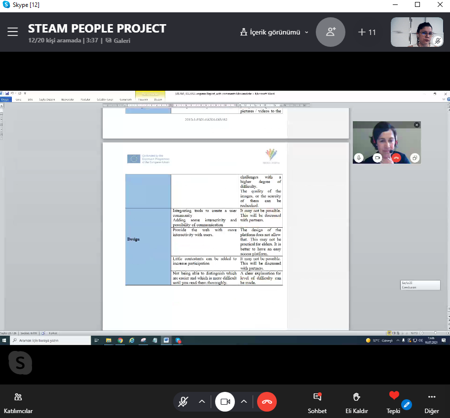 STEAM People Projesi çevrim içi proje yönetim toplantısı 16.07.2021 tarihinde tüm proje ortak kurumlarının katılımı ile gerçekleştirildi. Toplantıda test etkinliği sonunda yetişkin eğitmenleri ve yetişkin öğrenicilerden alınan geri bildirimler değerlendirildi. WebApp Platformu’nda yapılacak güncellemelere karar verildi.