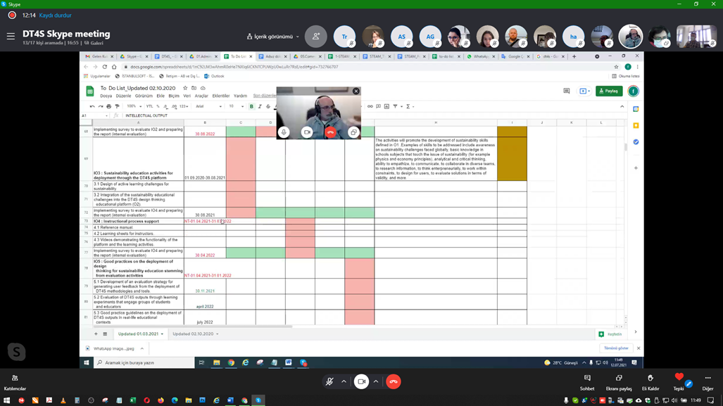 Uluslararası proje yönetim toplantısı 12.07.2021 tarihinde tüm proje ortak kurumlarının katılımıyla çevrim içi gerçekleştirildi. Toplantıda DT4S platformu, sürdürülebilirlik eğitimi faaliyetleri ve öğretim süreci destekleyecek materyaller üzerine görüş ve fikir paylaşımı yapıldı.
