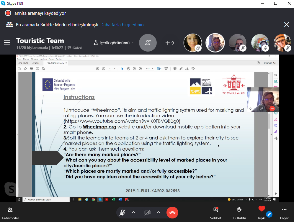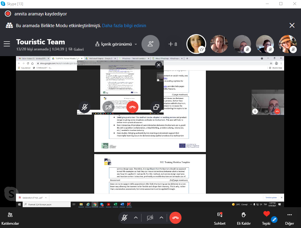 TOURISTIC projesinin personel eğitim faaliyeti 30 Haziran 2021 tarihinde çevrim içi olarak gerçekleştirildi. Faaliyette, ortak kurumlar tarafından hazırlanan öğrenme modülleri sunuldu ve test edildi. TOURISTIC Sanal Kampüs’te yer alacak Mesleki Açık Çevrim içi Derslerin geliştirilmesine dair planlama yapıldı.